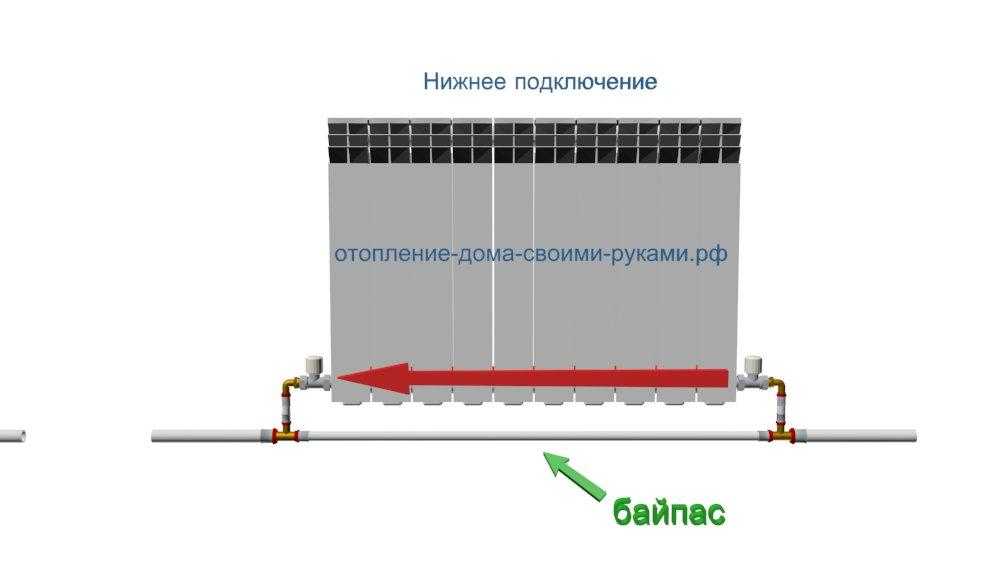 - обходную магистраль монтируют на максимально возможном удалении от вертикального участка трубопровода, как можно ближе к отопительной батарее;