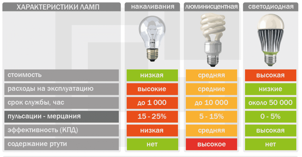 Долговечность. Конструктивные элементы лед-источников света невосприимчивы к большинству внешних факторов, не имеют перегорающих элементов (как в старых лампах — вольфрамовая нить). Срок службы средней энергосберегающей лампочки, по заявкам производителей, — около 10 000 часов работы, у светодиодной — от тридцати до шестидесяти тысяч.