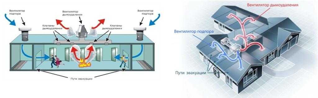 ) предназначена для удаления продуктов горения и тепла, и подачи чистого воздуха в здание при пожаре. Система обеспечивает безопасное нахождение людей на путях эвакуации, в зонах пожарной безопасности, в местах работы подразделений пожарной охраны, и иных местах, определенных разделом ППМ — противопожарные мероприятия.