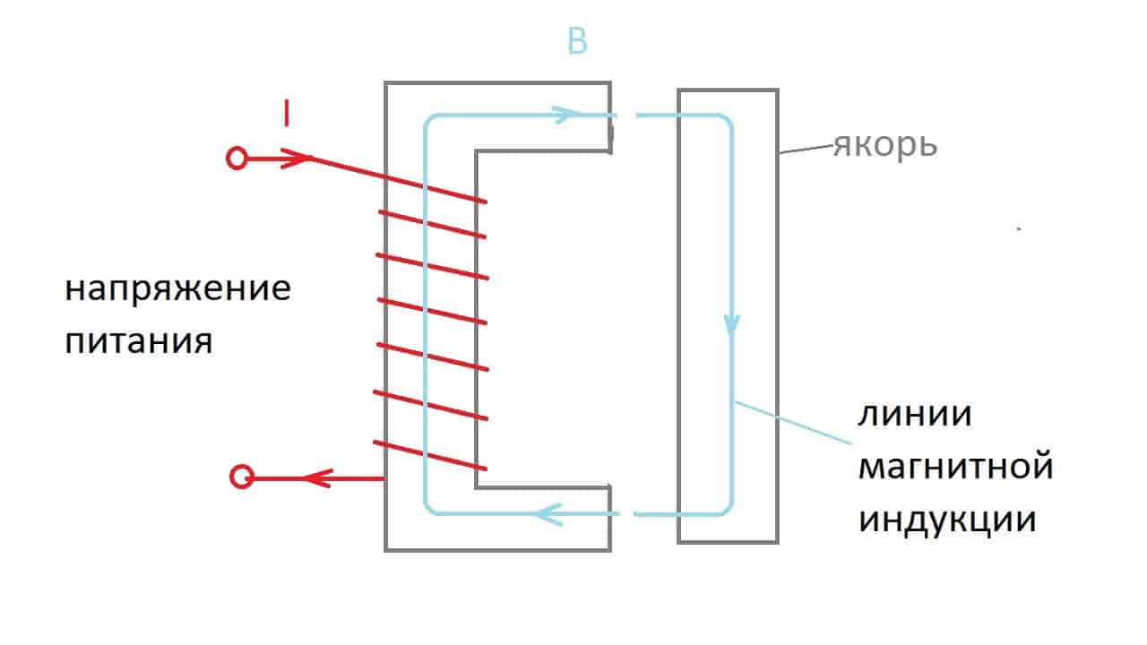 При протекании электрического тока I по виткам этой катушки генерируется магнитное поле (см. рисунок 2), результирующий вектор магнитной индукции B которого определяется по правилу Правой руки. При движении магнитного поля по сердечнику, ферромагнитный материал обеспечивает максимальную пропускную способность. Но, как только линии магнитной индукции попадают в воздушное пространство, магнитная проводимость существенно ухудшается и часть поля рассеивается.