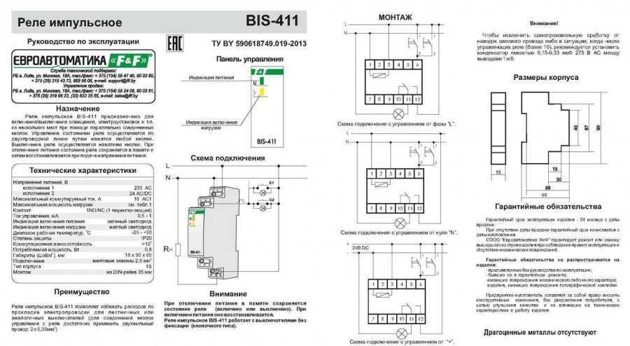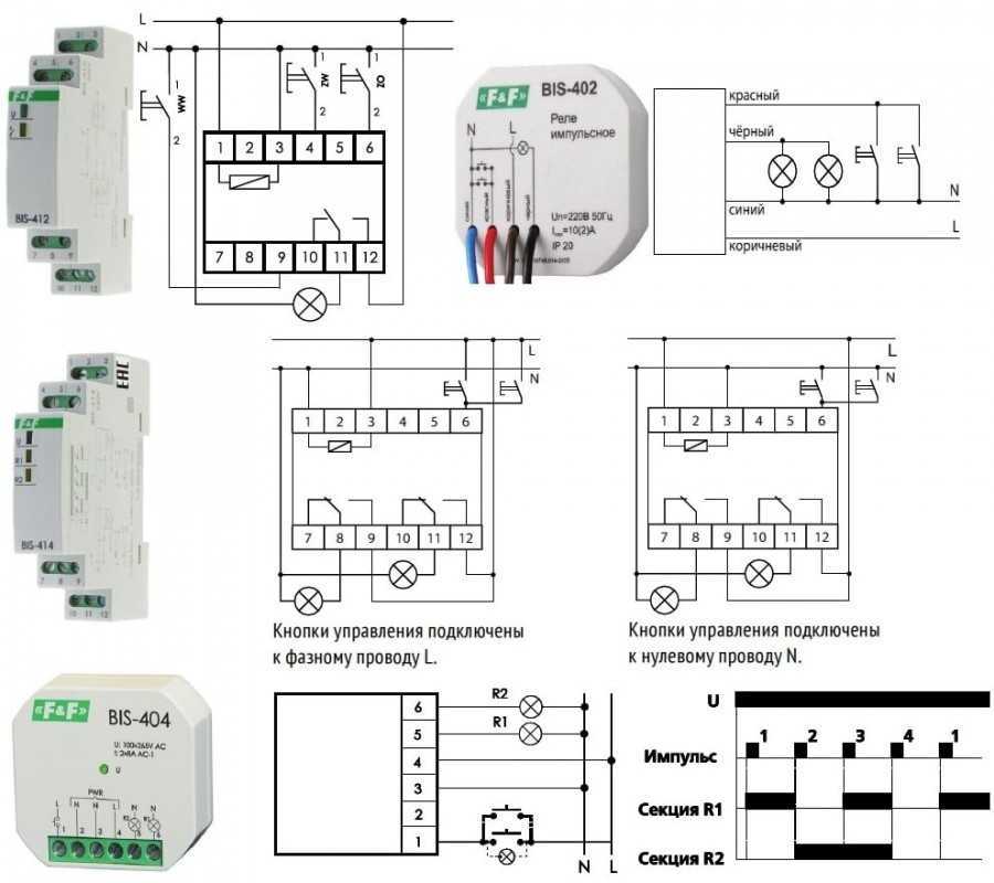 - импульсное электромагнитное реле бистабильного типа 411, способно передавать до 12в. Кнопки этого прибора параллельно соединены между собой, при этом, когда замыкаются контакты в одном месте, электрическая схема автоматически размыкает их в другом. Переключать можно любым удобным способом. Главным преимуществом является экономия кабеля, нет необходимости разветвлять проводку в квартире; Импульсное реле bis-414