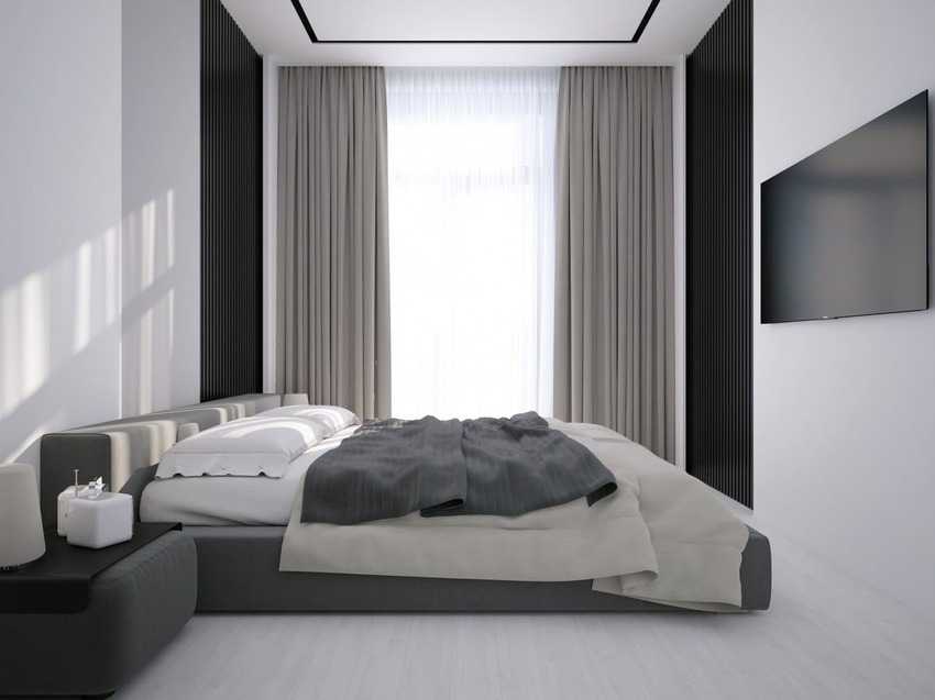 На фото серо-бело-черная спальня, выдержанная в минималистичном стиле.