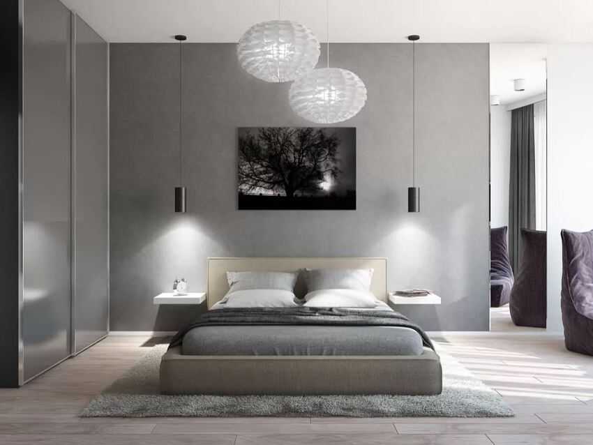 Какой стиль подходит для дизайна спальни с серыми обоями?