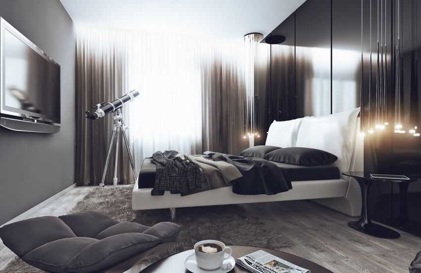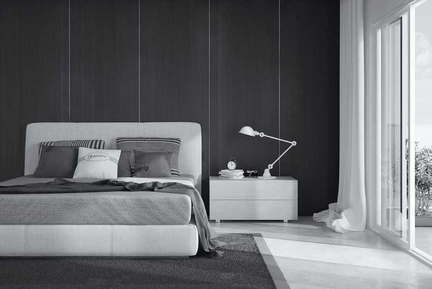 Черный цвет гармонично сочетается со светло-серыми тонами. За счет его присутствия, интерьер приобретает благородный и стильный облик. Великолепный контрастный черно-серый дуэт, характеризуется строгостью, лаконичностью и довольно часто применяется в оформлении спальной комнаты в стилистике хай-тек.
