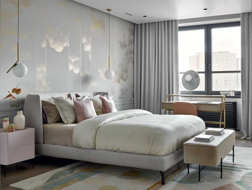 Комбинация серого и розового в интерьере спальни