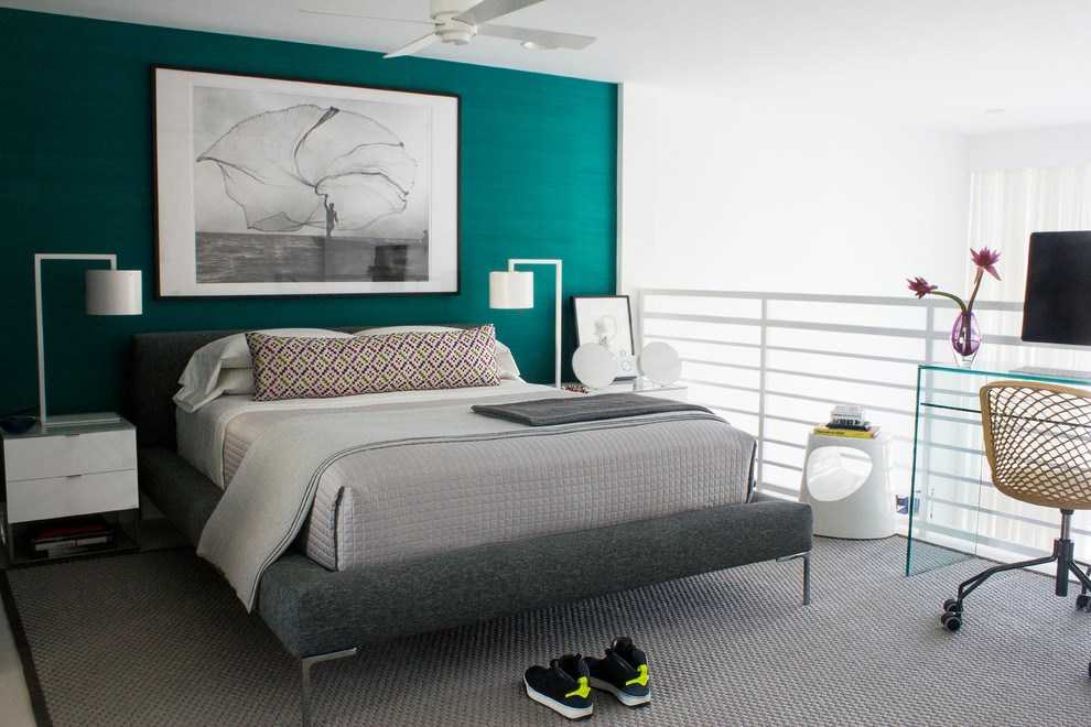Спальня в серых тонах с яркими акцентами