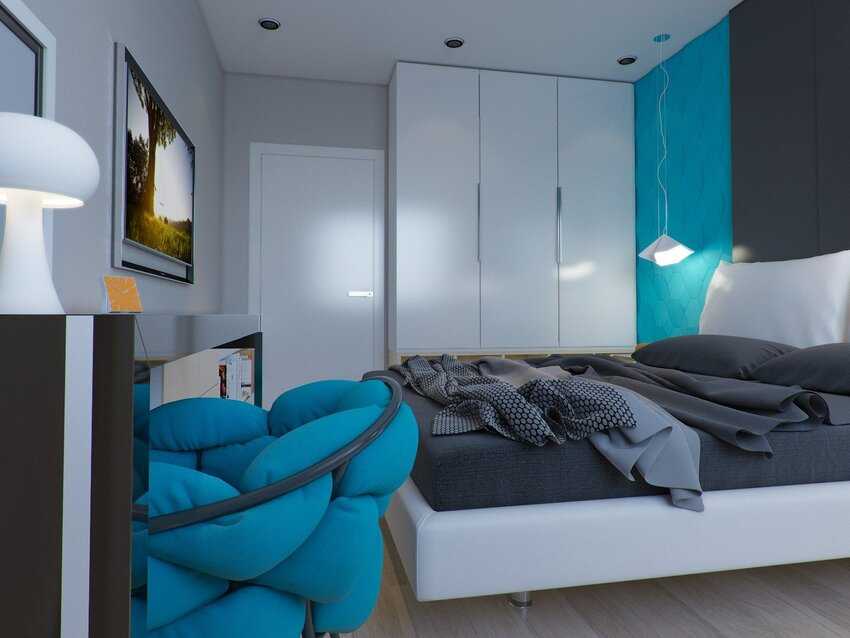 Спальня в сером цвете с добавлением синих оттенков, наполняется чувственной прохладой. Легкая акварельная, небесно-голубая цветовая гамма или насыщенный индиго, особенно хорошо будут смотреться в качестве отдельных акцентных деталей.