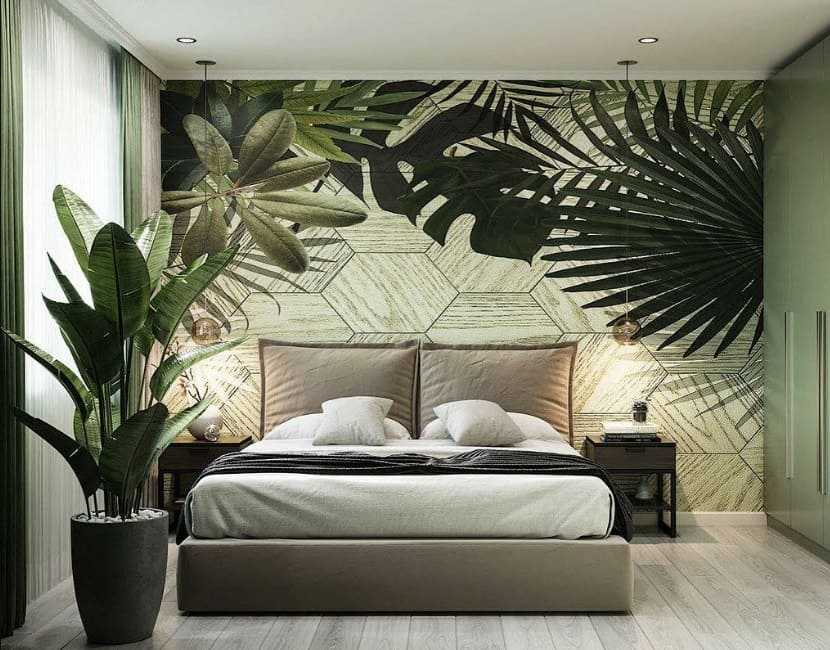 Если хочется добавить зеленой спальне шик, одну из стен можно оформить обоями с крупным узором — это визуально расширит комнату. Ни в коем случае не стоит оклеивать такими обоями все стены, это перегрузит спальню и в ней невозможно будет спокойно отдыхать.