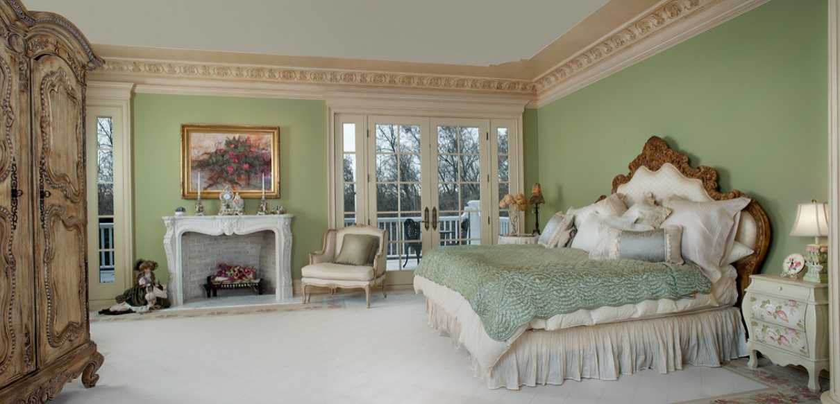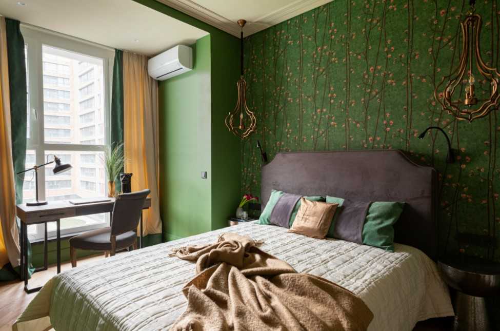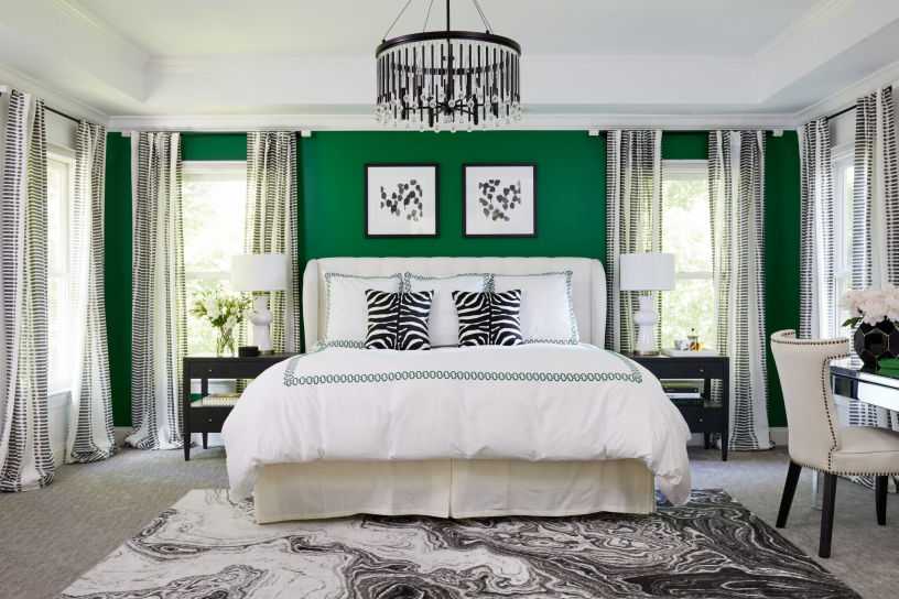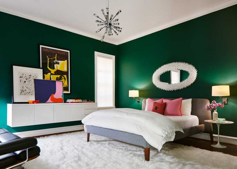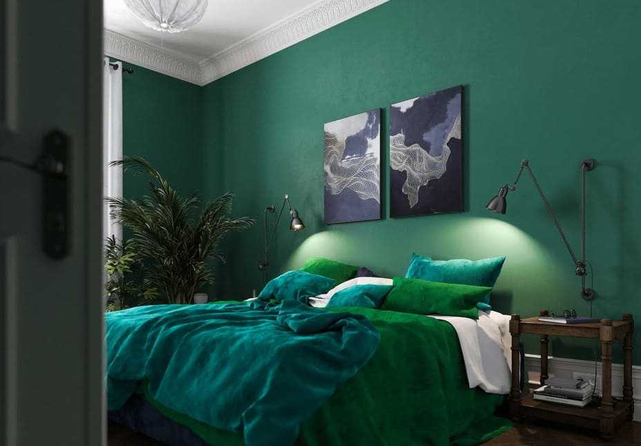 Изумрудный оттенок сделает дизайн спальни роскошным и изысканным. Его можно использовать в отделке стен и потолков.