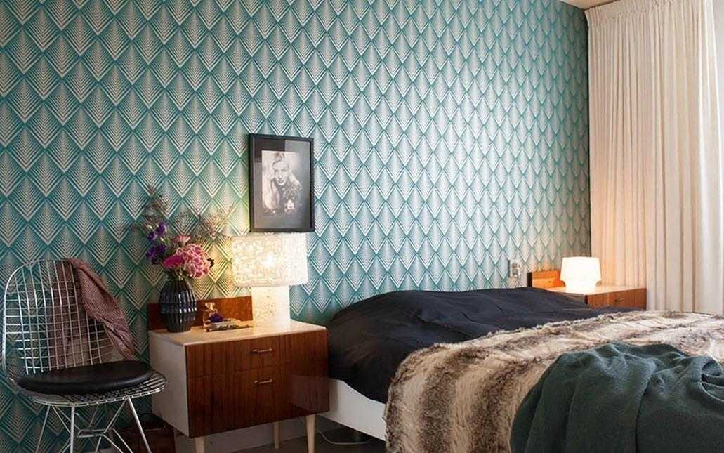 При ремонте спальни в зеленой колористике требуется использование обоев высокого качества. Так, например, одну или две стены можно обклеить обоями зеленого цвета, на которых присутствует геометрический орнамент.