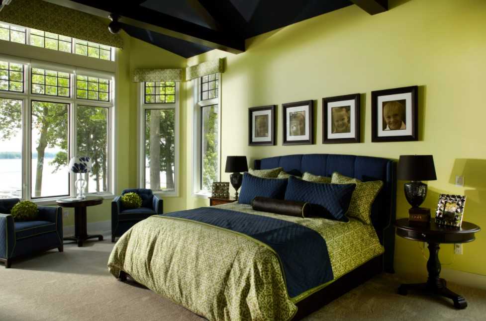 Одним из теплых оттенков зеленой палитры является цвет лайма. В тандеме с лавандовым, жёлтым, белым, оливковым, кофейным и песочным тоном он сделает дизайн спальни привлекательным и стильным.