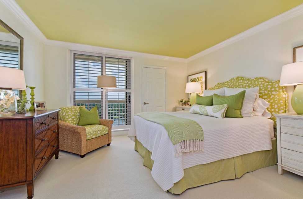 Если помещению не требуется столь яркое преображение комнаты, допустимо использование фисташкового тона для потолка, который поможет сделать дизайн спальни более глубоким и выразительным.