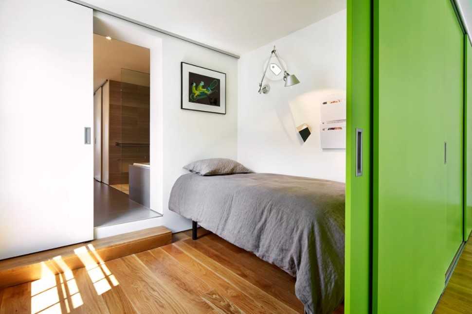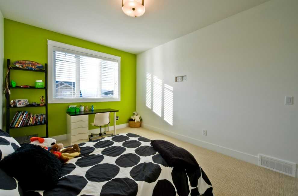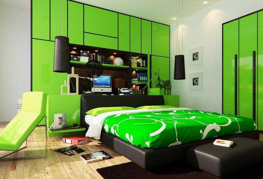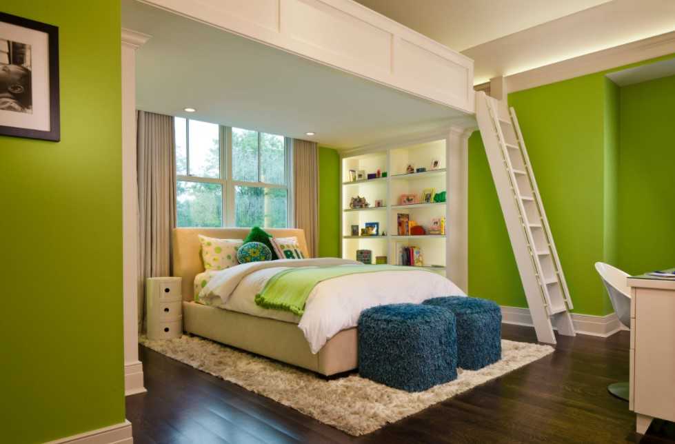Отделанная салатовыми оттенками спальня подойдёт и для взрослых, и для детей.