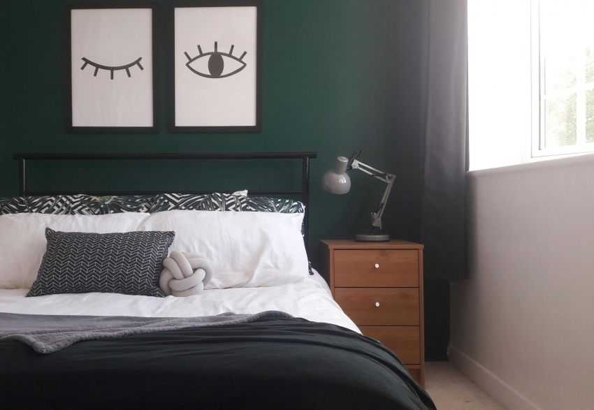 Изумрудный цвет ассоциируется с сочной зеленой травой ухоженного газона или летней лужайки, благодаря чему декор спальни действует как ненавязчивое снотворное.