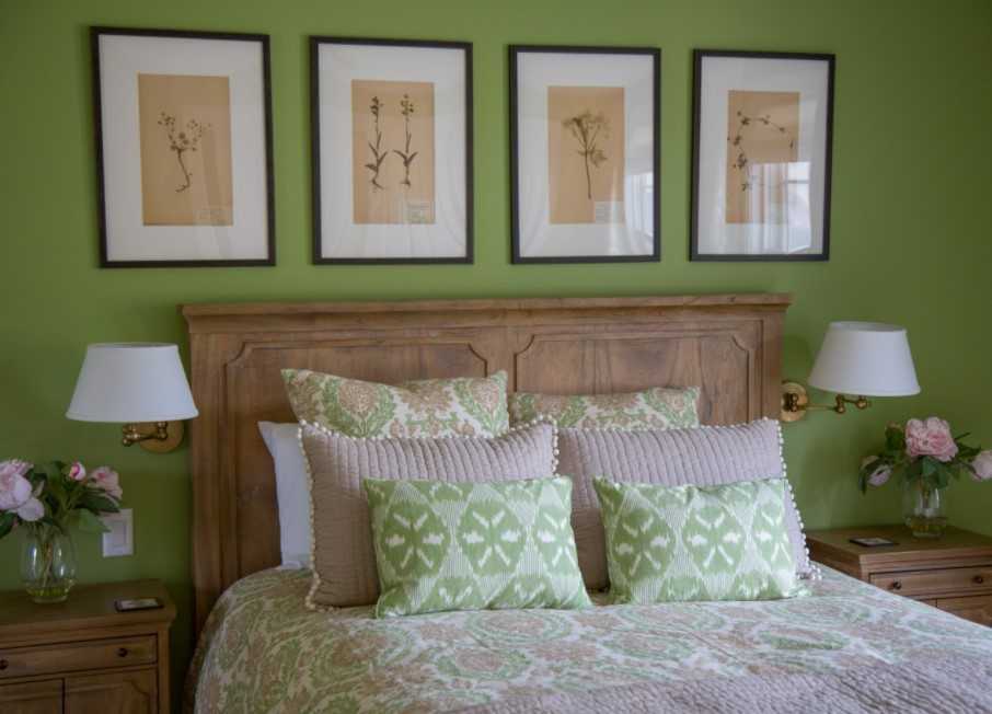Напольные светильники, стильные подсвечники, фотографии в узорчатых рамах, соломенные панно, комнатные цветы – вот возможные варианты аксессуаров для зелёной спальни.