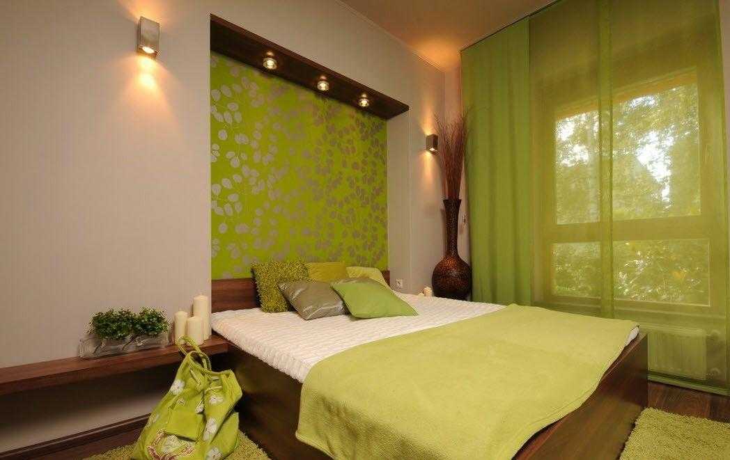 Помимо дополнительных оттенков, подобранных для оформления спальни в зеленом цвете, внимание стоит уделить светильникам. Модели могут быть как потолочные, так и располагаться на стене или на полу