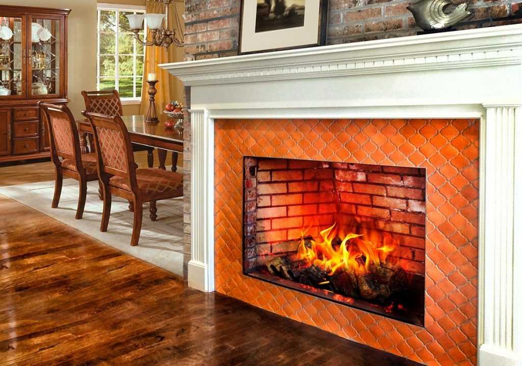 Данный метод уступает в изяществе, так как нет возможности декорировать камин орнаментом. Можно приобрести плиточный вариант, оформленный резьбой. Предпочтение стоит уделить глянцевой плитке, так как это позволит не впитываться копоти в поверхность изделия.