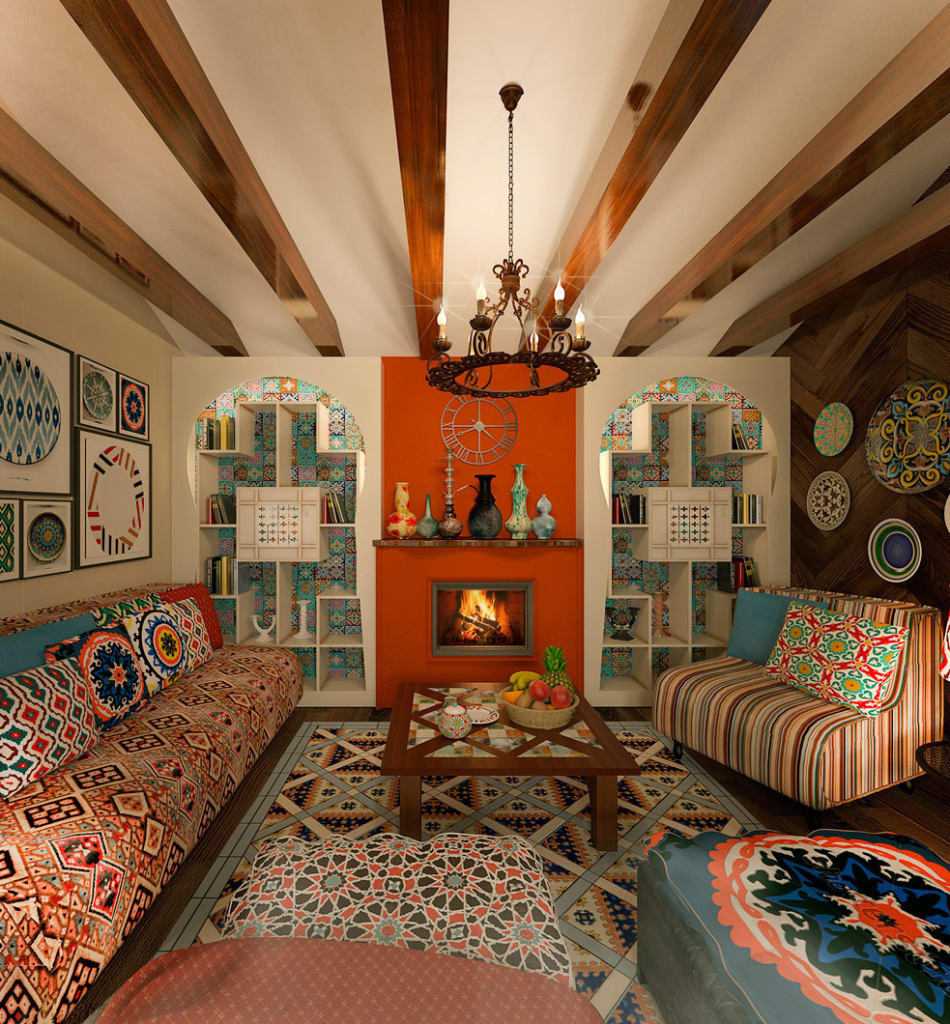 Невероятное разнообразие цветовой палитры является для этого направления важной чертой. Основные цвета для отделки комнаты – кремовый, песочный или терракотовый