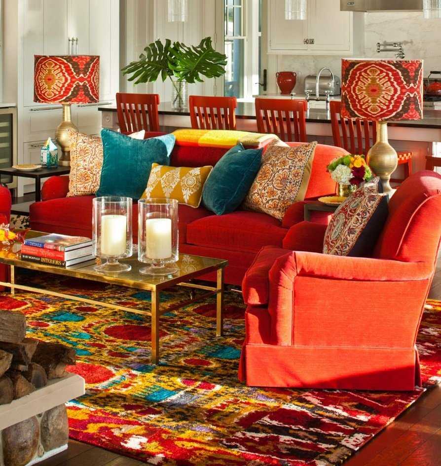 Более простым в воплощении является яркий интерьер в современном стиле. Характерной его чертой является размещение ярких предметов декора на нейтральном фоне стен. Создается ощущение радостно разбрызганных красок, количество которых умеренное. Интерьер получается свежим и легким.
