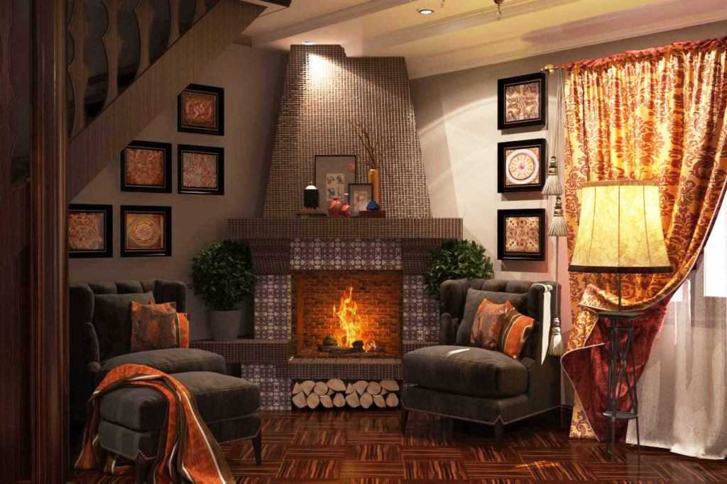 Интерьер восточного направления наполнен натуральными материалами для отделки и декорирования помещений. Для отделки используется камень, дерево, бамбук, а стены покрываются известняком или мрамором. Применяется много тканевого материала: парча, шелка, атлас. Из этих тканей и по сей день шьется одежда в восточном стиле. Особенно, если в доме 2 и более окон, то шторы в такую гостиную будут выглядеть массивно, но в то же время элегантно.