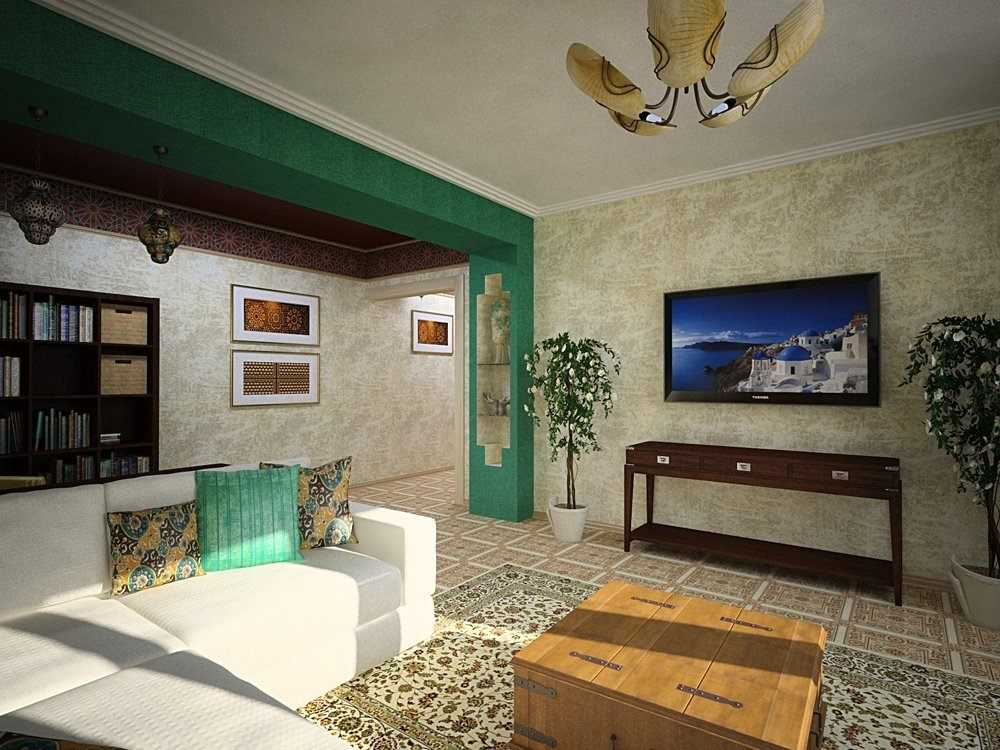 Расставить акценты позволят ковры, шкатулки с арабской вязью и камнями, оружие на стенах, фигурки, выполненные из слоновой кости.
