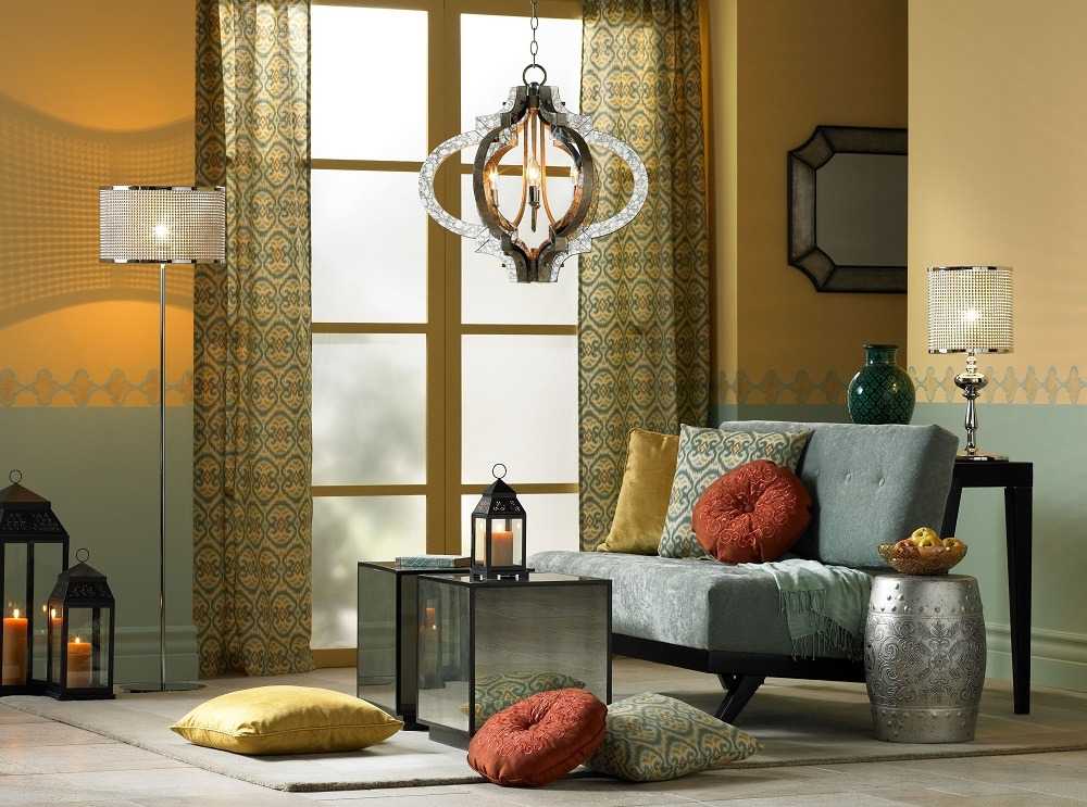 Ароматы и свет играют чрезвычайно важную роль в восточном интерьере. Итак, выбирайте латунные подсвечники, богато украшенные фонари из стекла и металла бирюзового, фиолетового и золотого цветов или ажурные модели, которые принесут мир и гармонию в интерьер с тонкими лучами света. Приобретите аппараты для эфирных масел и благовоний, благодаря им сладкий и пряный аромат красочных марокканских рынков будет распространяться по всей гостиной.