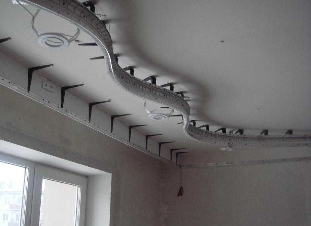 При многоуровневых конструкциях применяют специальные профили. Потери высоты в разных частях помещения при этом будут неодинаковыми. Для нижнего уровня багеты закрепляют на стене; промежуток до черновой поверхности должен равняться высоте профиля, скорректированной с учетом наличия разных коммуникаций, размещения электрической проводки, состояния чернового покрытия. Чаще всего потери составляют 9 — 15 см. Для больших комнат разрешается применение вариантов, где в некоторых местах потери составляют до 30 см.