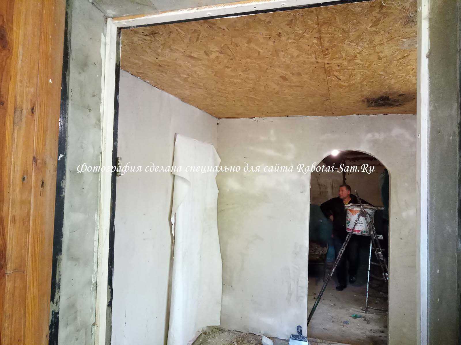 ШАГ 1: подготовка. Перед тем, как начинать монтаж ОСП плит, очищаем потолок, и подготавливаем стены. Со стен нужно сбить лишнюю штукатурку, и, если необходимо, выровнять. Мы не добиваемся идеально ровных поверхностей, так как стены будут выравниваться гипсокартоном. Мы укрепили оконный проем, как-то это все заштукатурили, и все. С потолка убираем потенциальные неровности и убираем старую глиняную замазку, проходим веником, чтобы убрать лишнюю пыль, и приступаем к монтажу ОСП.