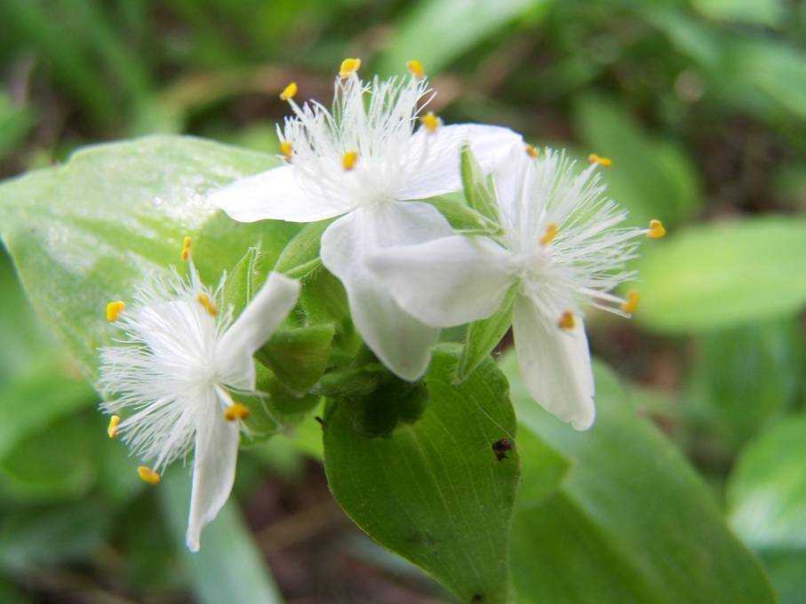 - Традесканция белоцветковая. Растение имеет оригинальные заостренные листья, ползучие отростки и крохотные белые цветки.