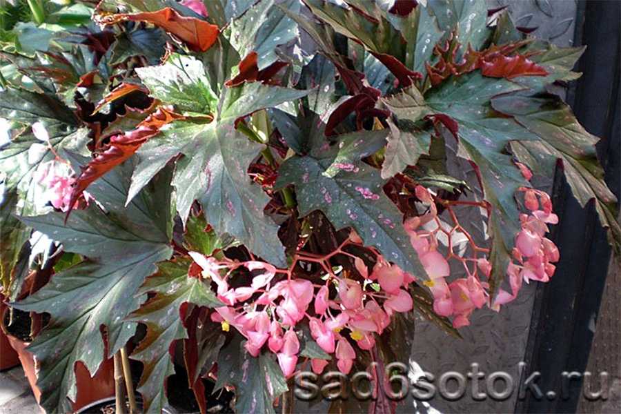 Лиственная часть имеет много схожего с кленом, потому такая бегония является одним из фаворитов для декора. Окрас варьируется от темно зеленого до оливкового с переходом в алый и бордо. Стебли крепкие, мясистые, покрытые ворсом. Кустарник разрастается до 50 см в высоту, но чаще всего останавливается на 30 см. Период цветения длится январь-февраль, когда появляются небольшие розовые цветки на тонких стеблях.