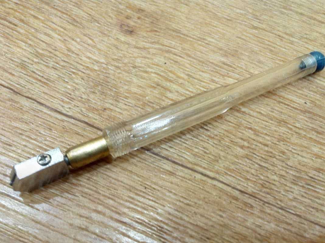 При применении алмазного стеклореза, необходимо его держать у самого низа ручки и проводить плавно линию по линейке, почти не надавливая на стекло.