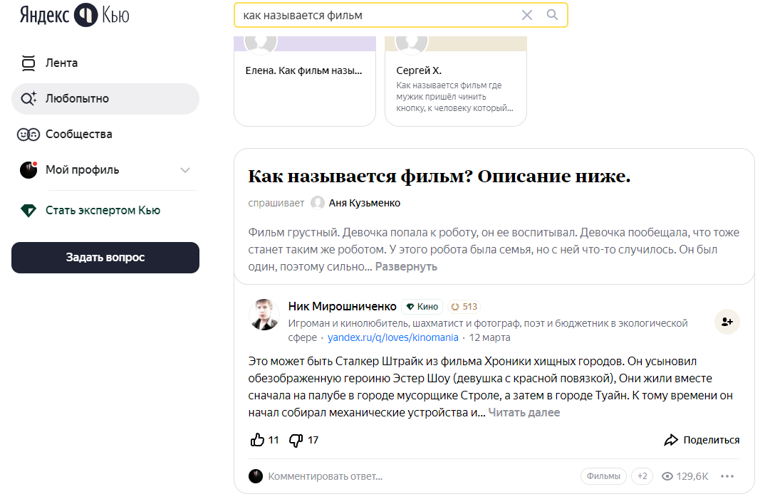 В таких сервисах как Яндекс.Кью, Ответы Mail.ru также обитают «спецы» по фильмам. Для поиска полного видео по отрывку достаточно задать вопрос, и вставить кадр из фрагмента. Киноманы подскажут вам правильный ответ.