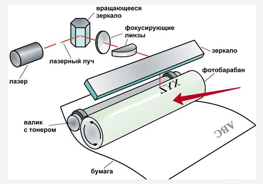 Световое изображение проецируется на это покрытие. Тонер, то есть специальный порошок, прилипает на засвеченный участок. Затем этот порошок барабан переносит на бумагу. Тонер при попадании на бумагу начинает плавиться и закрепляться с помощью нагревателя.