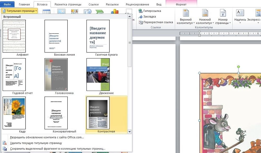 Для начала сделаем первую главную страницу. Чтобы она была красивой и презентабельной, используем встроенные возможности программы Ворд. В главном меню переходим на закладку «Вставка», а на ней находим раздел «Страницы». В нем — «Титульная страница». Из предложенных вариантов выбираем тот, что подходит по стилю и нравиться Вам больше всего.