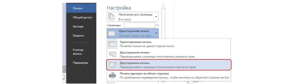 Если принтер поддерживает автоматическую печать на обеих сторонах, измените Печать однойстороны для печати на обеих сторонах листа. Выберите параметр Переворачивать страницы относительно короткого края, чтобы текст на обратной стороне не был перевернут.