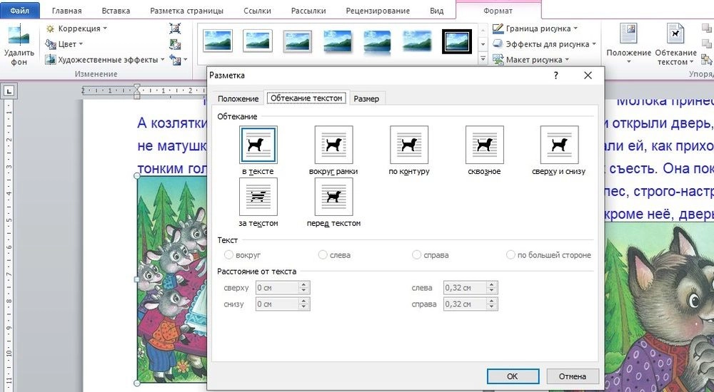 Активировать опцию «Обтекание текстом», выбрать подходящий вариант расположения рисунков в документе.