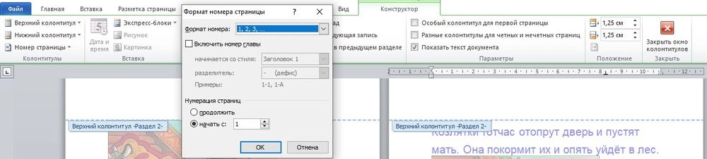 «Титулка» готова, а потому смело переходим к нумерации. Для этого в той же закладке «Вставка» активируйте кнопку «Номер страницы». Выберите место размещения (внизу, вверху, слева, справа) и формат в отдельном меню в том же списке ниже. А также пользователь имеет возможность вставить нижние или верхние колонтитулы. Там можно указать номер или название текущей главы, автора и тому подобные данные.