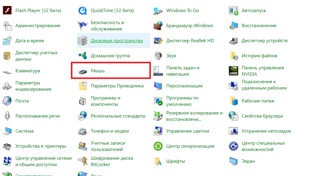 - выбрать раздел «Панель управления», затем подраздел «Мышь»;