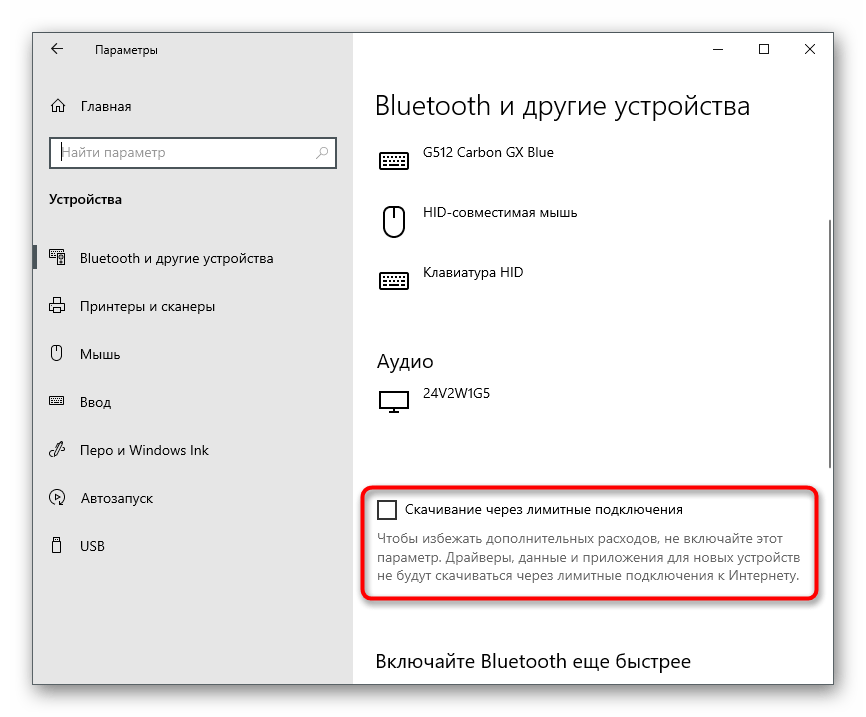 В списке с подключенными девайсами найдите пункт «Скачивание через лимитные подключения». Поставьте возле него галочку, после чего можно закрыть данное окно.