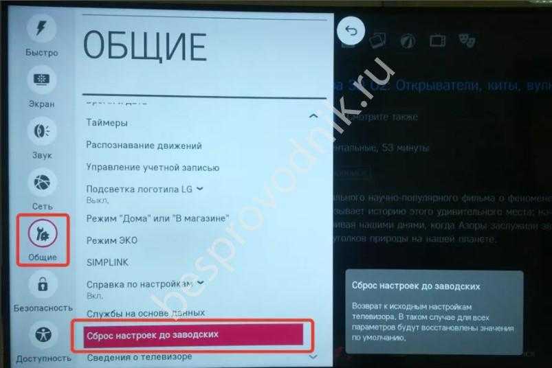 - Попробуйте сделать сброс настроек до заводских. Если рассмотренные выше шаги не дали результата, жмите на кнопку «Home» на ДУ, зайдите в «Настройки» (символ шестерни), перейдите в «Расширенные настройки», а после этого «Общие». Далее кликните на «Сброс настроек до заводских» и дождитесь перезапуска устройства. На последнем шаге введите пароль, если он был введен. Также может потребоваться настройка других параметров, если они сбились.