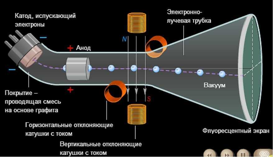 Эти электроны заставляют светиться точки люминофора, которым тонким слоем изнутри покрыта передняя стенка электронно-лучевой трубки. То есть энергия электронов превращается в свет, вот эти самые светящиеся точки и формируют изображение.