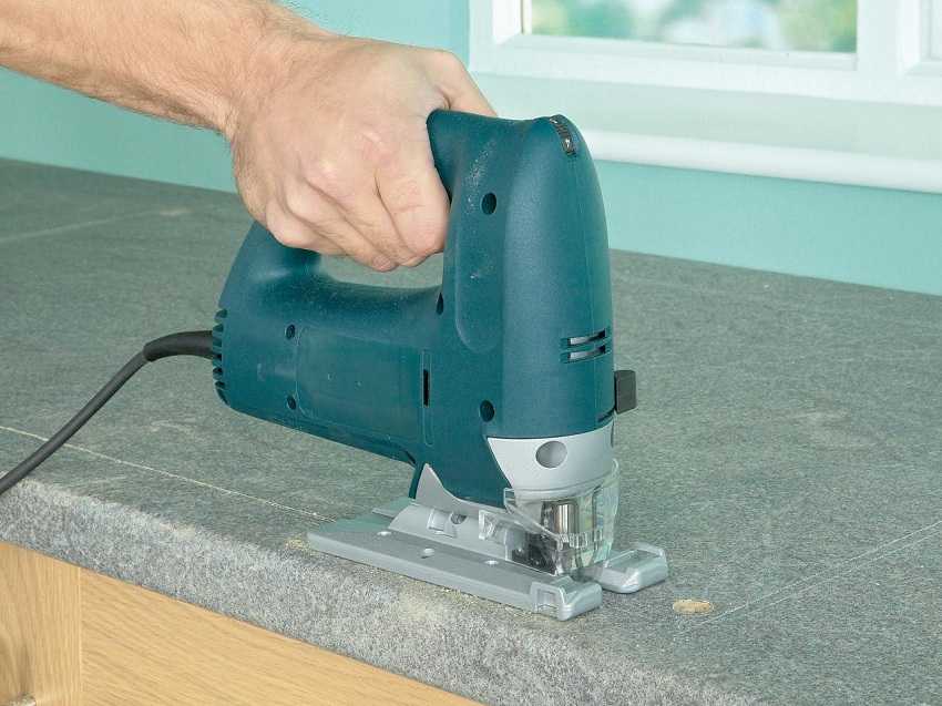 - электролобзиком вырезается контур. Для того, чтобы вырезать контур без особых трудностей, сначала высверлите в столешнице отверстие. После этого вставьте в него электролобзик и, приведите инструмент в действие;