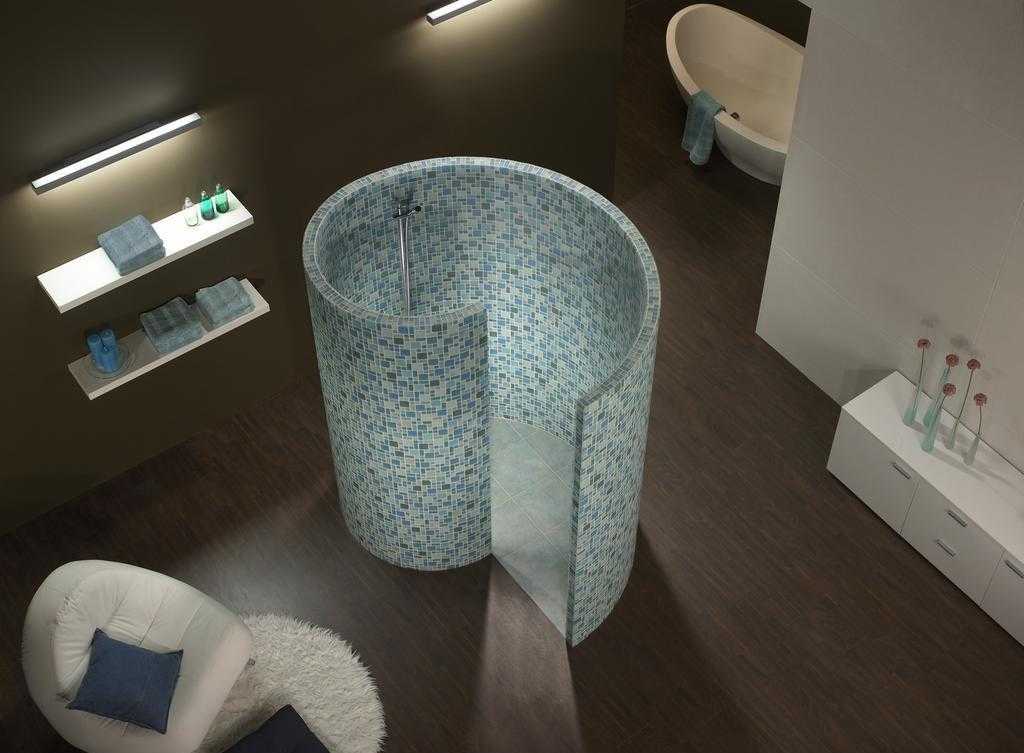 Часто, для самодельных кабинок выбирают плитку-мозаику, т.к. она позволяет легче работать с углами и плавными переходами.