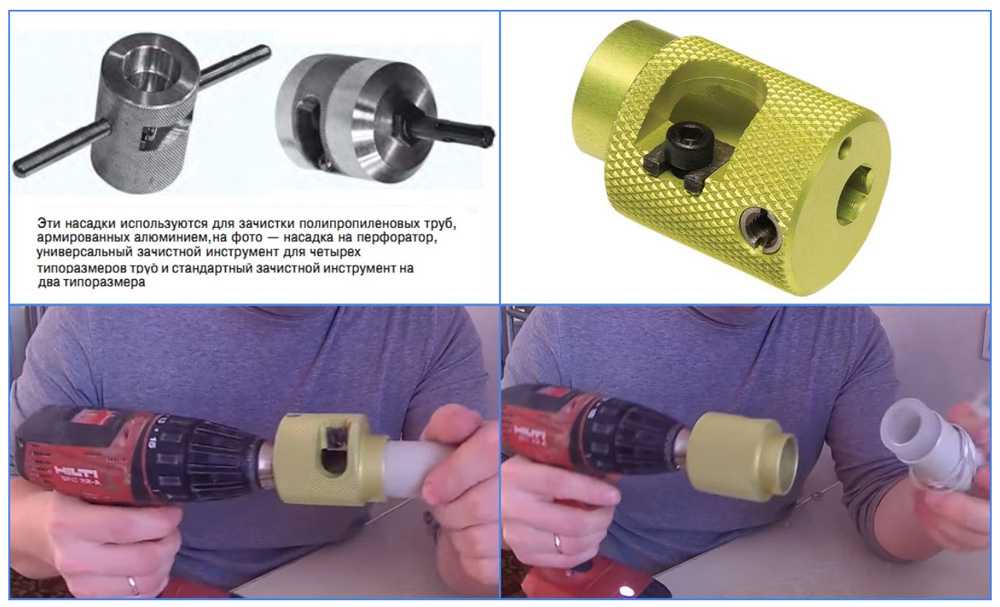 При использовании армированных алюминием труб — шейвер (зачистку с наружными ножами) или торцеватель (зачистку, ножи которой выбирают армирование через торец трубы). Первый инструмент применяется для внешнего армирования, второй — для армирующего слоя, расположенного в середине толщины стенки. |
