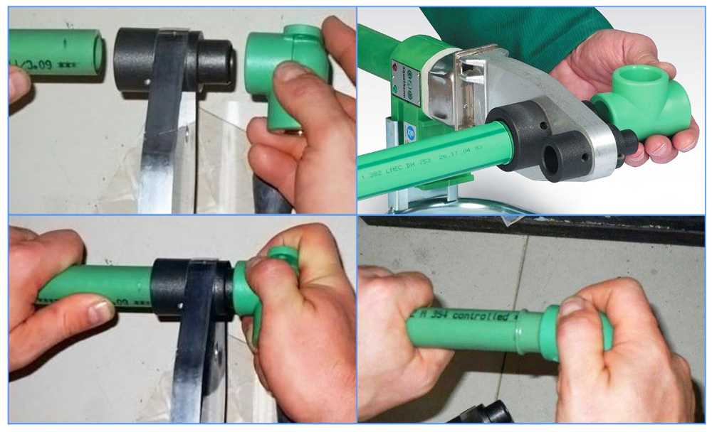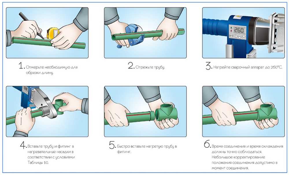 на паяльник крепится нужная насадка соответствующего диаметра; включается питание паяльника, выбирается температурный режим. Температура плавления указывается на самих трубах и в большинстве случаев составляет 260ºС. При достижении нужной температуры срабатывает реле, в некоторых моделях загорается/гаснет лампочка; отрезается труба нужного размера с помощью специальных ножниц. Ее длина должна быть больше расчетной на 30 мм, так как ее концы с двух сторон будут заходить в фитинги на 15 мм; спаиваемые поверхности очищаются от пыли и обезжириваются специальным средством. Они должны быть ровными и гладкими, без дефектов и деформаций; фитинг прикладывается к трубе в том положении, в котором они будут соединяться между собой. На трубе отмеряется 15 мм от края и ставиться отметка. Такая же отметка наносится и на фитинг; на насадку надевается фитинг, а в нее – труба. Желательно, чтобы элементы надевались одновременно для равномерного прогрева или же сначала фитинг, стенки которого толще, поэтому и прогреваются дольше. Во время нагревания нельзя двигать детали, вращать их или деформировать; время нагрева зависит от диаметра элементов: для 20 мм – 4-5 с, для 25 мм – максимум 7 с, для 32 мм – максимум 10; с насадки одновременно снимаются фитинг и труба и быстро, но аккуратно соединяются между собой