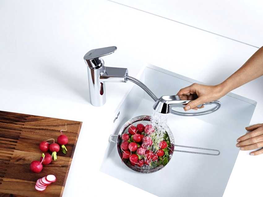Некоторые производители сантехнического оборудования и смесителей в частности решили пойти еще дальше ради нашего с вами удобства. К примеру, приходилось ли вам сталкиваться с необходимостью наполнить водой крупную кастрюлю, которая едва влезает в вашу раковину (или не влезает в нее вообще). А как потом такую кастрюлю, наполненную водой, вытаскивать из раковины? Здесь вам на помощь придет смеситель с выдвижным изливом. Фактически это шланг, который может вытягиваться достаточно далеко за пределы мойки (длина шланга варьируется в зависимости от модели смесителя).