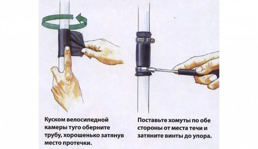 Только вот купить в магазине бандаж на трубу нужного диаметра удается далеко не всегда, поэтому, гораздо проще прибегнуть к самодельным методам установки пластыря, которые ничуть не хуже заводских обжимов. Для этого понадобится старая велосипедная камера, которая наверняка найдется у вас дома или у ваших знакомых, у кого есть или когда-то был велосипед. Из нее по продольной линии вырезают ножницами одну или две длинных полосы. То есть, если вы разрежете камеру вдоль штуцера по всей её длине, то получите одну широкую полосу, которую обычно разделяют на две части – такой ширины вполне достаточно.