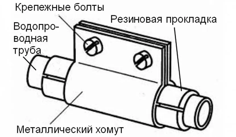 Ремонтные хомуты, благодаря своей конструкции, обеспечивают недорогой и экстренный ремонт канализационных и водопроводных труб Источник experttrub.ru Очень эффективным временным методом починки металлических труб (сталь, чугун) является резиновый бандаж, принцип которого показан на верхнем изображении. Но это не означает, что такой пластырь можно накладывать непосредственно на прореху, не предпринимая никаких дополнительных мер. Резина, это вязкий и эластичный материал, который при натяжении и прижиме плотно обтекает поверхность, но зачистка зоны непосредственно у протечки – обязательна. В таком выполнении временная заделка прорехи может стоять годами, пока хозяева не решатся поменять чугун на ПВХ, что чаще всего и происходит в городских квартирах.