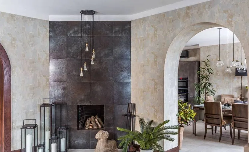 Часто вместо декоративного камня используют кирпичную плитку. Этот материал влагостойкий и огнеупорный. Способен прослужить несколько десятков лет. Так же, как в предыдущем варианте, ее выкладывают в разброс по контуру проема или формируют ровные края. Хорошо сочетается как со штукатуркой, так и с обоями.