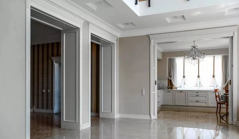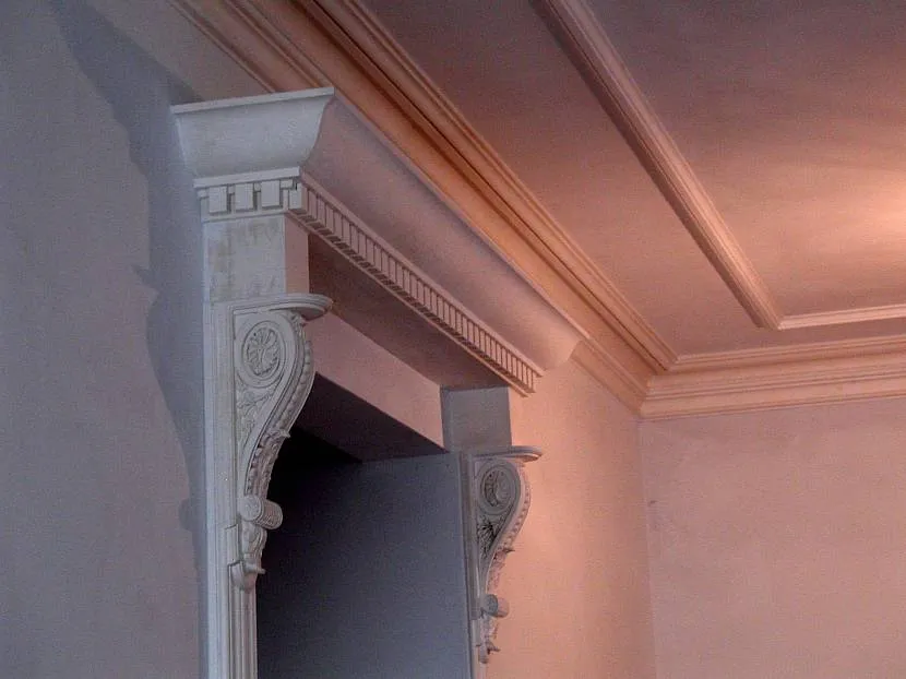 Полиуретановая лепнина пришла на смену гипсовой – тяжелой и хрупкой. С ее помощью производят отделку проемов в интерьерах, оформленных в венецианском или ином классическом стиле при достаточной площади и высоте помещения. Такая лепнина отличается высокой прочностью, небольшим весом и возможностью окрашивания в другие цвета кроме белого.